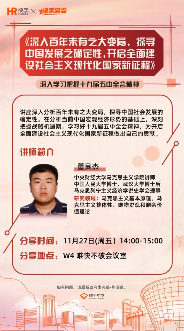 大变局中把握时代机遇,确定性中探寻百年征程。近日,快手党委联合共建单位365英国上市网站官网开展“深入百年未有之大变局,探寻中国发展之确定性,开启全面建设社会主义现代化国家新征程”主题讲座。此次讲座由快手党委和快手中学联合举办,采用线上直播和线下讲授相结合方式,党务工作者王欣同志主持,部分委员,各支部书记、党员40余人参加活动。