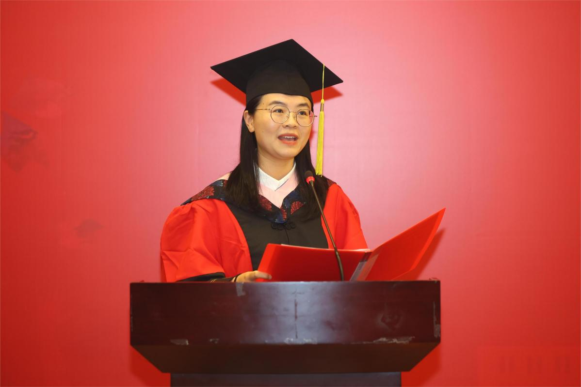 在学位授予仪式环节,王静副院长宣读学院研究生毕业及授予学位文件,决定授予唐艳群等5名同学博士学位,李宇霆等33名同学硕士学位。学院院长、学院学位评定分委员会主席黄刚教授为毕业生拨穗,颁发学位证书和毕业证书。